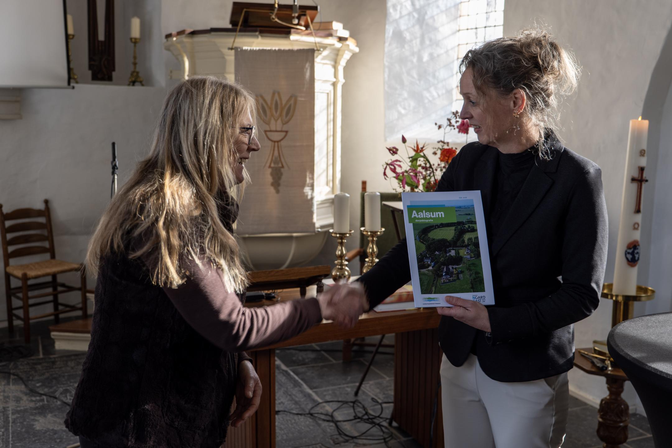 In het oude kerkje van Aalsum is donderdag 19 februari de eerste dorpsbiografie van Noardeast-Fryslân uitgereikt. Directeur Enit Scholtens van Landschapsbeheer Friesland gaf het boek aan wethouder Hanneke Jouta. Zij gaf het eerste exemplaar door aan Dorpsbelang Aalsum.
