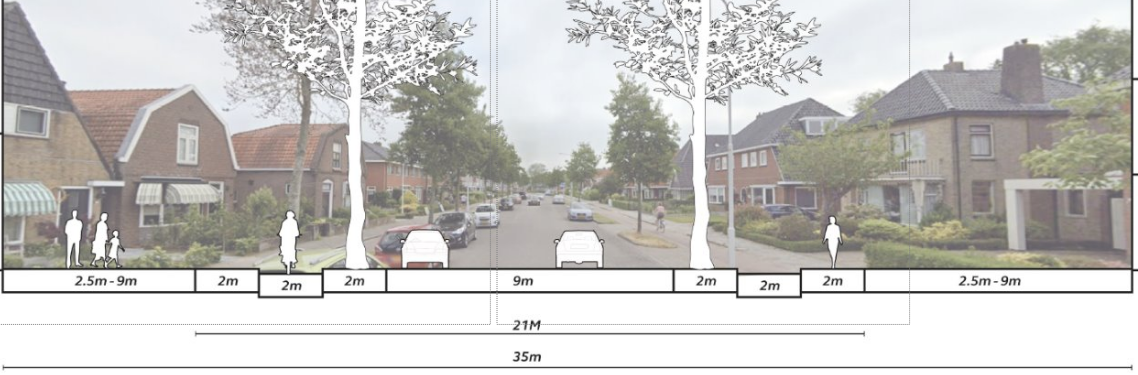 Op basis van de plannen en de input van de bewoners hebben we een voorkeursontwerp gekozen. Dit is een laanprofiel met een breed fietspad aan de schoolzijde (noordkant), een smallere rijbaan voor auto’s en veel groen langs de weg. Parkeervakken en inritten worden zoveel mogelijk in de groenzones opgenomen, zodat het straatbeeld rustig en groen oogt.